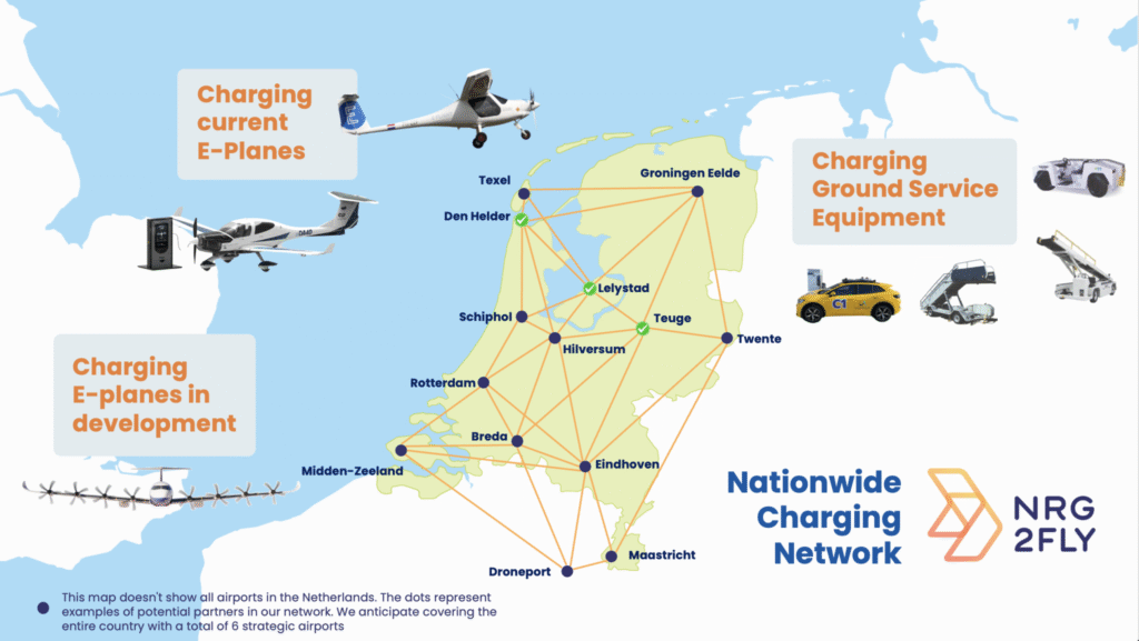 NRG2fly ontwikkelt het eerste landelijke laadnetwerk voor elektrische vliegtuigen in Nederland. Op Lelystad Airport – onderdeel van Schiphol Group – is dat al werkelijkheid. Concrete energie-hubs op luchthavens waar vliegtuigen met een stekker kunnen opladen. Op Teuge Airport is een testfaciliteit gebouwd waar wordt gedemonstreerd hoe een energienetwerk inclusief laadinfrastructuur werkt. De infrastructuur groeit.